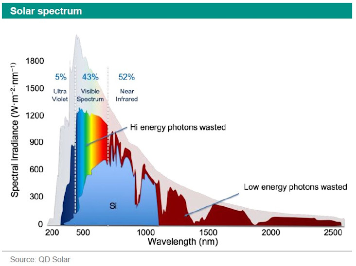 Another promising emerging solar technology is quantum dots. They are considered to be artificial atoms. Their energy levels are adjustable by altering their size. So the size of the quantum dot defines what part of the spectrum of sunlight can be absorbed. Some of the materials are toxic though. Moreover, degradation increases in aqueous and UV conditions.