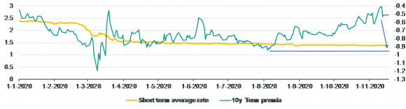 US Rates: US yields to move lower and curves to flatten in the near term – Recently, the US yield curve has steepened on the back of the adoption of an average inflation target by the Fed and the possibility of a ‘Blue Wave’ (i.e. Democrats winning control of the Senate). We assume a split Congress in our base case. Nevertheless, yields will be relatively high at the end of 2020 as the market is still pricing in some risk of Democrats winning the runoff elections on 5 January (see above). Markets are therefore vulnerable to a repricing after the election, with the supply of US Treasuries expected to be significantly lower on the back of lower anticipated fiscal stimulus. We judge that this will depress the term premia again, which has increased by about 40bp since July as shown in the graph below. Consequently, we expect that longer-term US Treasury yields will move significantly lower and that the curve will flatten in Q1.