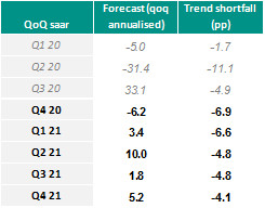 Given the stronger pace of the recovery so far in the US, we are actually raising our 2020 forecast, to -4.2% from -4.8% previously. However, this is significantly weaker than the latest consensus forecast of -3.6%. At the same time, we are lowering our 2021 growth forecast slightly, to 3.2% from 3.4% previously. This reflects the spill over of partial lockdowns into the early part of 2021, the time it will take for vaccines to be fully rolled out, and the corresponding delay to the recovery. However, we still see the economy ending 2021 roughly 4 percentage points below trend – i.e. below where the economy likely would have been had the pandemic not happened. As such, while the recovery is coming somewhat later than expected, the net effect is similar to our previous projections. This reflects stronger quarterly growth on average during Q2-Q4 than in our previous projection. As vaccines our rolled out, a significant lifting of restrictions from the second quarter onwards should spur rapid economic growth during the course of 2021.