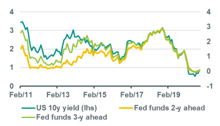 From Q2 2021 onwards, we expect growth to pick up quickly, as the most vulnerable people will be inoculated against covid-19. We expect US yields to move slightly higher and the curve to steepen somewhat (as shown in the table below). Meanwhile, we judge that it will be a while before the Fed’s target of average inflation of 2% will be reached. Indeed, we expect that it will be reached in 2024 or later in our base case. As a result, we judge that the fed funds rate will be on hold for the coming years, which will anchor short term rates, but also restrain Treasury yields, as explained below. Finally, we judge that the Fed will continue to absorb new Treasury supply through large-scale purchases . This means that the rise in yields is likely to be very modest in the coming years. As a result, the US treasury curve will steepen only modestly from Q2 onwards.Although yields typically rise and curves steepen more significantly during economic recoveries, crucially this is usually linked to expectations that the Fed will start a rate hike cycle in the coming years. Indeed, every Treasury market sell-off of the last few years went hand-in-hand with sharply higher expectations for the fed funds rate. This is shown in the chart below, which shows the 10y yield and market expectations of the fed funds rate in 2 years and 3 years.