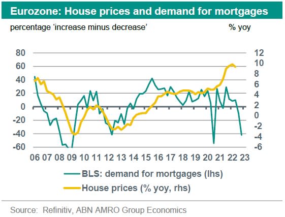 First time buyers and recent borrowers are most vulnerable to changes in mortgage interest rates. In the eurozone, the demand for mortgages – according to the ECB’s Bank Lending Survey (BLS) – has been an a strongly declining path. Indeed, in the most recent BLS, 42% of banks reported a substantial drop in demand for housing loans, which was the biggest drop since the first quarter of 2012 (excluding the pandemic period). The rise in mortgage interest rates as well as a drop in consumer confidence were mentioned as key factors behind reduced demand for housing loans. This is a clear signal that rising borrowing costs have made housing less affordable to newcomers, which also have to deal with the recent rise in house prices. Meanwhile, refinancing of mortgages has naturally become unattractive as mortgage rates have surged. Changes in BLS mortgage demand tend to be a good leading indicator for turning points in the housing market, now pointing to significant price corrections.