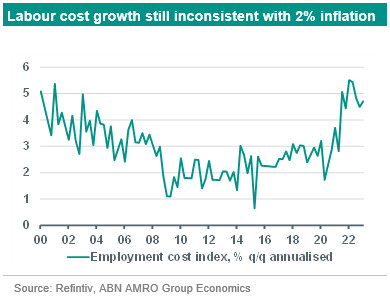 We expect similar language in the May policy statement, perhaps even repeating verbatim the language of the March statement. Given the persistence in underlying inflation – confirmed by the elevated Employment Cost Index reading for Q1 released last Friday – we think it is unlikely the Fed would completely remove the tightening bias and shift to more neutral language at this stage. Instead, we think it will wait for clearer signs that the economy is weakening, and that underlying inflationary pressures are cooling.