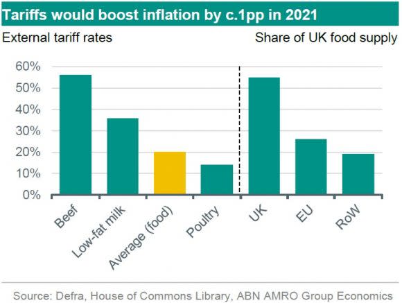 The UKGT largely mirrors the CET, notwithstanding some simplifications, with the average tariff on food products for instance falling from 22% to 20%. In a no deal scenario, under WTO rules the UK will have to apply this tariff schedule to EU as well as non-EU imports. The UK imports around 26% of its food from the EU (55% is sourced domestically, and the remaining 19% imported from elsewhere). As a significant importer from the EU, a no deal scenario would therefore raise food price inflation; we estimate this would push up overall 2021 inflation by around 1pp to 2.5%.