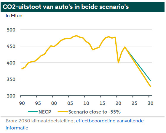 De effectbeoordeling bevat gedetailleerde informatie over de CO2-emissies van vervoer, ook per subcategorie. De CO2-uitstoot van auto's zal naar verwachting dalen van 447 Mton in 2022 tot 328 Mton voor de scenario dichtbij 55% reductie en 345 Mton voor het NECP-scenario. Dit is een daling tussen 23-27% (voor het hele wagenpark). Zoals hierboven aangegeven verbruikt momenteel een groot percentage auto's fossiele brandstoffen. In 2030 zullen auto's die fossiele brandstoffen gebruiken naar verwachting nog steeds dominant zijn, maar de rol van batterij-elektrische auto's neemt toe tot 11-14% van het totale wagenpark.