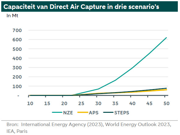 De grafiek toont de directe afvang van CO2 in drie scenario's. De groene lijn is Net Zero in 2050, de gele lijn is het Announced Pledges Scenario of APS en de donkere lijn Stated Policies Scenario of STEPS. In al deze scenario's tot 2030 is de Direct Air Capture capaciteit nog steeds onbeduidend in vergelijking met de totale CO2-uitstoot wereldwijd. Na 2030 neemt de rol van directe luchtafvang toe in absolute en relatieve termen omdat de wereldwijde uitstoot afneemt in het Netto Nul Scenario. In de andere twee scenario's blijft het afvangen van CO2 uit de atmosfeer via directe luchtafvang minder dan 1% van de totale jaarlijkse CO2-uitstoot. De capaciteit is dus beperkt.