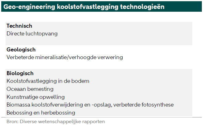Geo-engineering verwijst naar een reeks opkomende technologieën die het milieu kunnen manipuleren en een deel van de klimaatverandering kunnen compenseren. Geo-engineering is een term die veel technologieën omvat die over het algemeen in drie categorieën vallen: koolstofvastleggingstechnologieën, beheer van zonnestraling en beheer van aardstraling. In dit rapport richten we ons op koolstofvastleggingstechnologieën. Koolstofvastlegging is het proces van opvangen en opslaan van koolstofdioxide in de atmosfeer. Dit omvat een breed spectrum aan technologieën die koolstofdioxide uit de atmosfeer halen en vervolgens opslaan. Deze technologieën proberen het verband tussen emissies en concentraties te verbreken (zie voor meer informatie).
