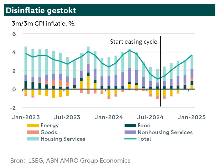 Over het algemeen moet men voorzichtig zijn met het toekennen van te veel gewicht aan één enkele meting. Tegelijkertijd is de trend in de inflatie sinds het begin van de versoepelingscyclus duidelijk. De Fed verlaagde de rente met 50 basispunten toen de 3m/3m inflatie zich op een meerjarig dieptepunt bevond, maar sindsdien is de inflatie gestegen naar niveaus die in de buurt komen van de bovenkant van de bandbreedte in de afgelopen twee jaar. Niet teveel gewicht aan het enkele januari rapport geven, betekent dit dat er geen reden is om aanhoudende m/m-waarden van 0,4 of 0,5% te verwachten, maar de bredere recente trend maakt duidelijk dat we de komende maanden ook geen waarden moeten verwachten die consistent zijn met een j/j-percentage van 2%. Zonder de aangekondigde importheffingen, verwachtten we een langzame maar gestage vooruitgang in de richting van het inflatie doel, omdat de inflatoire druk van lonen of huisvesting grotendeels is afgenomen. Uit gegevens van derden, afkomstig van Zillow, blijkt dat er geen hernieuwde druk is op de woninginflatie en dat de CPI zijn achterstand grotendeels heeft ingelopen. Gegevens over de loonstijging, bijvoorbeeld van Indeed, blijven gematigd en zijn geen belangrijke bron van inflatoire druk.