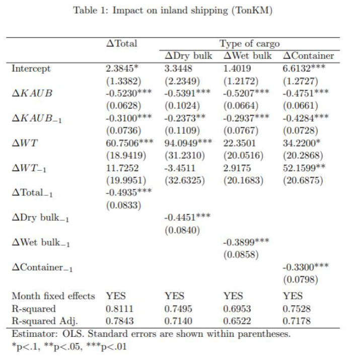 De resultaten van de regressieanalyse in fase 1 zijn samengevat in tabel 1. Uit de analyse blijkt dat lage rivierstanden bij Kaub een significante invloed hebben op het vrachtvervoer in Nederland. Een extra dag met lage waterstand vermindert het totale gewicht dat over de rivier wordt vervoerd met 0,5%. Dit betekent dat een reeks van dertig opeenvolgende dagen onder de drempel het vrachtvervoer met ongeveer 15% vermindert. Uit onze analyse blijkt ook dat de effecten aanhouden - de coëfficiënt op de eerste vertraging van de waterstand is -0,3, wat betekent dat dertig opeenvolgende dagen onder de drempel leiden tot een cumulatieve vermindering van het vrachtvervoer met 24% gedurende twee maanden. Beide coëfficiënten zijn significant op 1%-niveau en de resultaten zijn robuust voor de verschillende vrachtcategorieën (nat, bulk en container).