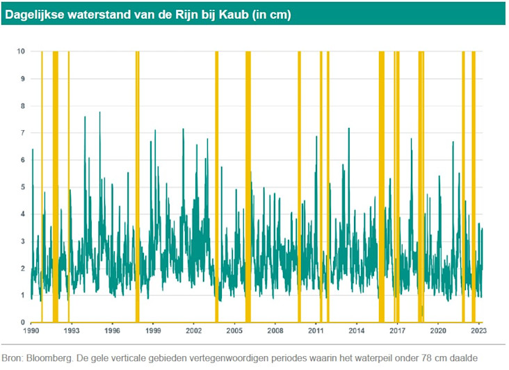 In de afgelopen jaren, met name in 2018 en 2022, waren er perioden van droogte die leidden tot zeer lage waterstanden in de Rijn, waardoor de binnenvaart ernstig werd beperkt en de Duitse industrie werd afgeknepen. Lagere waterstanden beperken geleidelijk de transportcapaciteit van binnenschepen, omdat de maximaal beschikbare diepgang van het schip afneemt. Bij bepaalde waterstanden kunnen schepen elkaar niet meer passeren op smalle knelpunten, waardoor de transportcapaciteit van de rivier nog verder afneemt. Tot slot, als het waterpeil onder de minimaal toegestane diepte voor de binnenvaart zakt, komt het verkeer tot stilstand. Het grootste knelpunt in de Rijn bevindt zich bij het Duitse stadje Kaub. Volgens het Kiel Institute for the World Economy daalt de industriële productie met 1 procent als het waterpeil bij Kaub 30 dagen onder de 78 centimeter zakt. Industrieën die aan de Rijn gevestigd zijn omvatten onder andere de staalindustrie, de chemische industrie en producenten van bouwmaterialen.