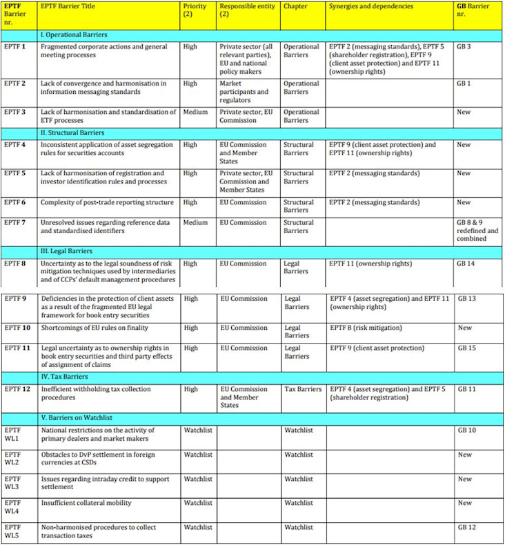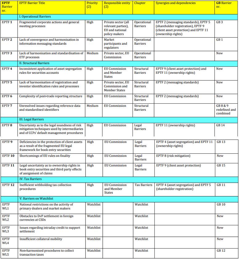 To renew the attention to dismantling the post-trade Barriers, the Commission asked the European Post Trade Forum (EPTF) to reassess these barriers and determine which barriers still exist and require attention. The EPTF published their on 15 May 2017.