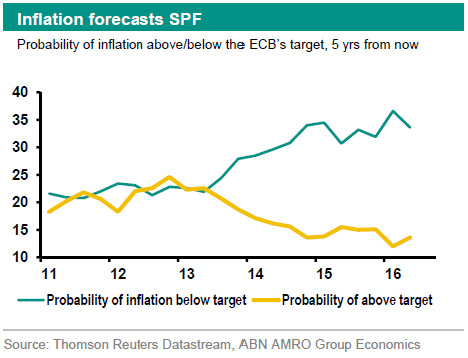 The ECB’s Survey of Professional Forecasters (SPF) for 2016Q2 was also published this week. It revealed that confidence in the ECB meeting its inflation target in the medium term has risen somewhat. Whereas the forecast for the inflation rate five years ahead remained unchanged at 1.8%, the probability attached to the ECB meeting its target rose. The participants to the SPF attached a probability of 53% to inflation being in a narrow range around 2% five years from now. The probability of inflation below this target declined from 37% in Q1 to 34% in Q2, while that of inflation being higher than the target increased from 12% to 14%. The fact that a higher probability was attached to the ECB meeting its target for inflation in the medium term was probably due to the extra policy easing measures announce by the central bank in March.