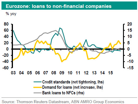 The ECB’ Bank Lending Survey (BLS) for Q1 showed that banks, on balance, continued to ease credit standards for loans to non-financial companies. Credit standards eased at an accelerated pace (-4% in 2015Q4 to -6% in 2016Q1).