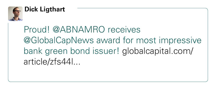 'News site Global Capital announced the winners of its Sustainable and Responsible Capital Market Awards on 6 September. ABN AMRO won the Most Impressive Green Bank/SRI Bond Issuer category. A green bond is one which allows investors to back sustainable projects. With our , we help institutional investors looking to invest their assets sustainably. The very high standard we apply has earned us the Climate Bond Certification Mark. Of course, it’s nice to be recognised, but more important than the award is that the certification mark raises the bar. After all, anyone can call a bond “green” to greenwash their image. But a hallmark of quality like this gives investors real confidence.'