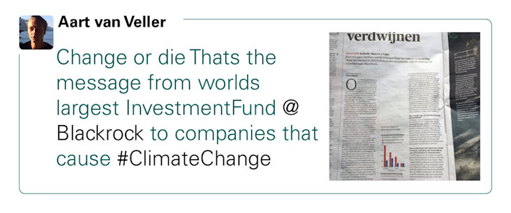 'Larry Fink, CEO of Blackrock, has warned Fortune 500 companies: if you fail to include sustainability risk in your business management strategy, you’re going to make bad choices, and we won’t invest in you any more. Hearing this message from the CEO of the world’s largest asset manager, and not from an environmental activist, makes a big difference. It shows once again that companies which don’t take sustainability seriously will miss the boat. After all, there’s a reason why regulators ask financial institutions to give due weight to sustainability risks in their planning and decision making.'