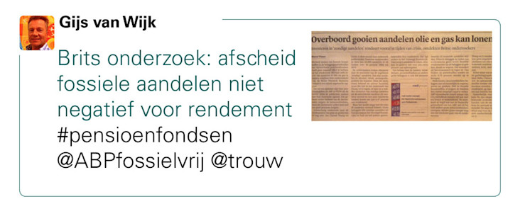 ‘This study shows that sustainable investment does not produce lower returns than mainstream investment. A lot of pension funds are already cautiously avoiding direct investments in oil and gas companies. That’s a good start, but their policies could be much more sustainable. As the research demonstrates, this doesn’t result in lower pensions for members. Sustainability doesn’t have to be pricey.’