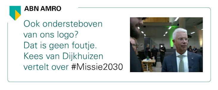 Some things are so obvious they’re easy to miss. For instance, we’ve decided to turn our logo upside down to publicise Mission 2030. It’s a huge project involving two-thirds of all the money the bank lends – a whopping EUR 185 billion. Together with our clients, we can make a major impact, so we’re doing everything we can to raise awareness of Mission 2030.