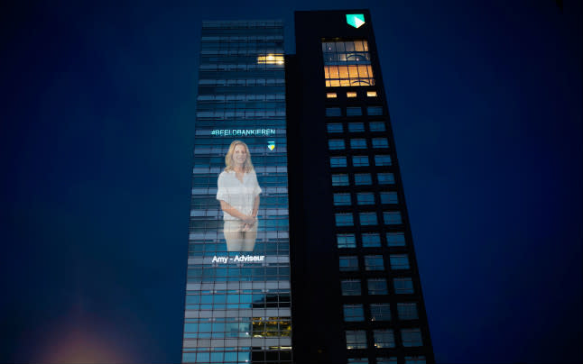Voorbijgangers, treinreizigers en automobilisten op de ring A10 kon het gisteravond nauwelijks ontgaan. Op het hoofdkantoor van ABN AMRO aan het Gustav Mahlerplein in Amsterdam verschenen levensgrote projecties van medewerkers. Hiermee geeft ABN AMRO een gezicht aan haar adviseurs die klanten in heel Nederland via videogesprekken adviseren over financiële zaken: snel, gemakkelijk én persoonlijk. De campagne #Beeldbankieren laat zien dat persoonlijk advies en nieuwe technologie hand in hand gaan. Een derde van alle adviesgesprekken vindt al plaats via Beeldbankieren, voor de gesprekken over wonen is dit zelfs 61 procent. De projectie op het hoofkantoor van ABN AMRO aan het Gustav Mahlerplein in Amsterdam is ’s avonds nog te zien tot en met zondag 20 mei.