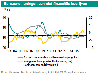 Per saldo is de vraag naar bedrijfskrediet in het eerste kwartaal opnieuw gestegen (+17%), maar minder hard dan in het vierde kwartaal van 2015 (+27%). De vraag naar krediet gaat meestal min of meer gelijk op met vertrouwensindicatoren als de PMI voor de industrie en de Ifo-index. De dalende groei van de vraag naar leningen lijkt dan ook het verslechterende economische klimaat in de eerste maanden van dit jaar te weerspiegelen. De banken noemen voorraden en werkkapitaal, de rentestand, en fusies en overnames als de belangrijkste factoren die de vraag naar krediet verklaren. De bijdrage van investeringen in vaste activa blijft positief, maar was in het eerste kwartaal klein vergeleken met de andere factoren en ook kleiner dan in het laatste kwartaal van 2015. Dit wijst erop dat bij de investeringen in vaste activa, die in het laatste kwartaal van vorig jaar flink waren gegroeid, de groei in het eerste kwartaal van dit jaar is teruggelopen.