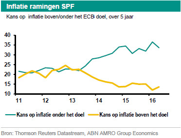 Deze week heeft de ECB ook haar Survey of Professional Forecasters (SPF) voor het tweede kwartaal van 2016 gepubliceerd. Daaruit blijkt dat het vertrouwen dat de ECB haar inflatiedoel op middellange termijn gaat halen, iets is toegenomen. Waar de prognose voor het inflatiecijfer over vijf jaar onveranderd is gebleven op 1,8%, werd de kans dat de ECB haar beleidsdoel zou halen, hoger ingeschat. De ondervraagden schatten de kans dat de inflatie zich over vijf jaar in een smalle band rond 2% zou bevinden op 53%. De kans dat de inflatie lager uit zou komen, daalde van 37% in het eerste kwartaal naar 34% in het tweede, terwijl de kans dat de inflatie hoger dan het inflatiedoel zou uitpakken, van 12% naar 14% steeg. Dat men de kans dat de ECB haar inflatiedoel op middellange termijn zal halen, hoger inschat, komt waarschijnlijk door de extra verruimingsmaatregelen van maart.