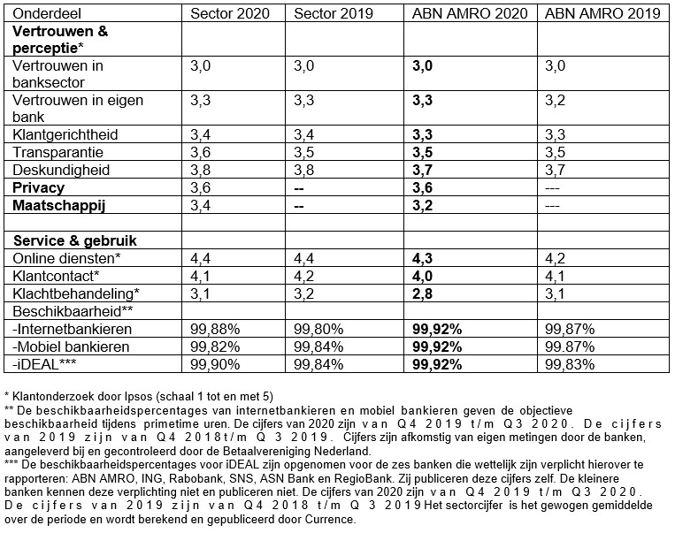 Op 11 januari 2021 is de Vertrouwensmonitor Banken 2020 gepresenteerd. Ook ABN AMRO werkte mee aan de Vertrouwensmonitor Banken 2020. Met de onderzoeksuitkomsten zijn we - naast onze eigen bevindingen - nog beter in staat om te achterhalen op welke gebieden we het goed doen en waar we kunnen verbeteren.