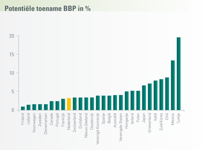 Het Economisch Bureau onderzocht voor 28 landen hoeveel het BBP kan toenemen bij een hogere arbeidsparticipatie van vrouwen. In bepaalde, vooral opkomende landen (onder andere Turkije, Mexico en Chili) werken nog altijd relatief weinig vrouwen, waardoor het economisch potentieel daar hoog is. Met name Scandinavische landen lopen voorop bij de arbeidsparticipatie van vrouwen. De potentiële groei van het BBP is daar beperkter, omdat de Scandinavische landen al op een hoog niveau zitten. Nederland neemt met een mogelijke toename van 3% internationaal gezien een tussenpositie in.