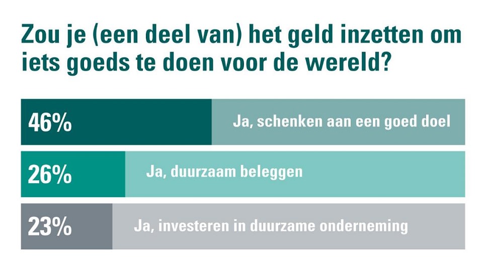 Hoewel de meesten het niet één van de voornaamste bestedingsdoelen vinden, zouden jongeren gemiddeld toch 186.200 euro inzetten om bij te dragen aan het creëren van een betere wereld. Dat kan onder andere door geld te schenken aan goede doelen, te beleggen of te investeren in duurzame ondernemingen.