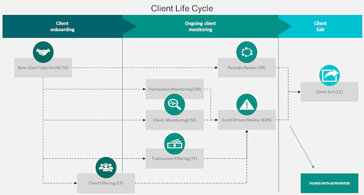 Client Life Cycle-proces in ons programma ter bestrijding van witwassen en terrorismefinanciering (AML/CFT).