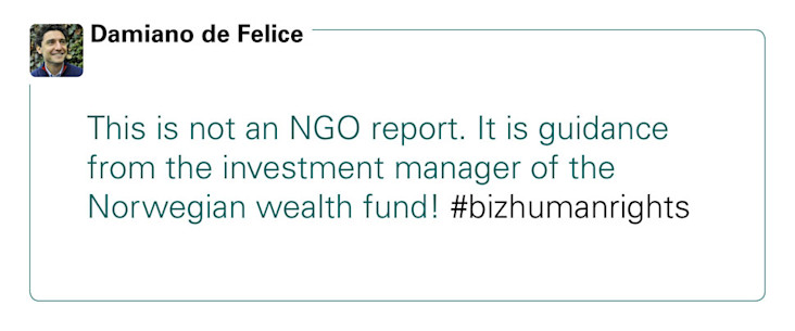 ‘Een rapport over mensenrechten. Niet van een ngo, maar van het Noorse staatspensioenfonds: een van de grootste investeerders in de wereld. Dat zegt tegen bedrijven: “als jij wilt dat wij in jou beleggen, dan verwachten wij stappen van je op het gebied van mensenrechten”. Een mooi voorbeeld van de wijze waarop een investeerder verbeteringen afdwingt in het bedrijfsleven. Dat doen we als bank ook. Bijvoorbeeld met de ABN AMRO Human Rights Guide. Daarin geven we aan waar we als bank staan op het gebied van mensenrechten, maar leggen we ook uit wat we verwachten van onze klanten en de bedrijven waarmee we werken.’