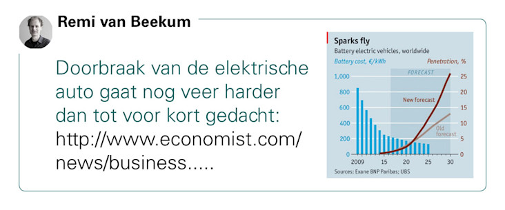 'Innovaties hebben soms wat moeite om van start te gaan. Maar als ze dan eindelijk omarmd worden, dan kunnen de ontwikkelingen steeds harder gaan. De elektrische auto heeft zijn bekendheid misschien te danken aan Elon Musk en zijn Tesla. Maar inmiddels gaat het niet meer (alleen) om hem. Volkswagen, BMW, GM en Toyota voelden zich opgejaagd en zijn ook aan de slag gegaan. En die producenten zorgen nu voor de enorme groei in elektrisch rijden. Nu ook de machtige autolobby is gaan draaien, is er geen weg meer terug. Dat toont deze grafiek wel aan. Maar ere wie ere toekomt: zonder Elon Musk waren we nu niet zo ver gekomen.'