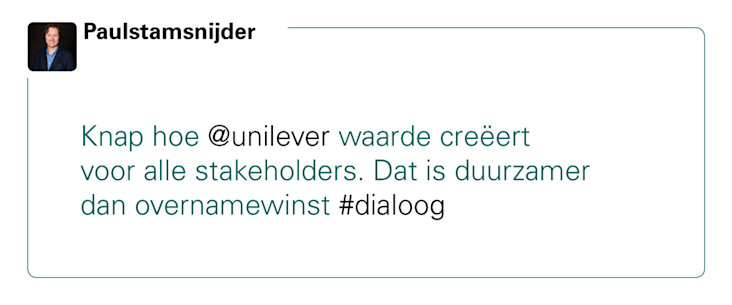 'Unilever ontving een vijandig overnamebod waarmee de duurzaamheidsambitie van het bedrijf bijna op het spel kwam te staan. Zo’n langetermijnstrategie is dus wel degelijk kwetsbaar als er een groep aandeelhouders opstaat die voor de korte termijn graag meer rendement wil zien.'