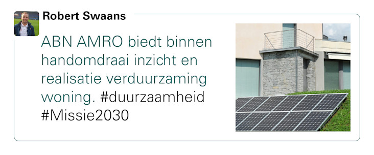 Het unieke aan Missie 2030 die door onze ceo Kees van Dijkhuizen is aangekondigd, is dat de hele bank nu dezelfde agenda heeft als het om vastgoed gaat. We willen bankbreed werken aan een duidelijke stip op de horizon: in 2030 moet ons vastgoed - dat van onze klanten én van de bank zelf -gemiddeld energielabel A hebben.