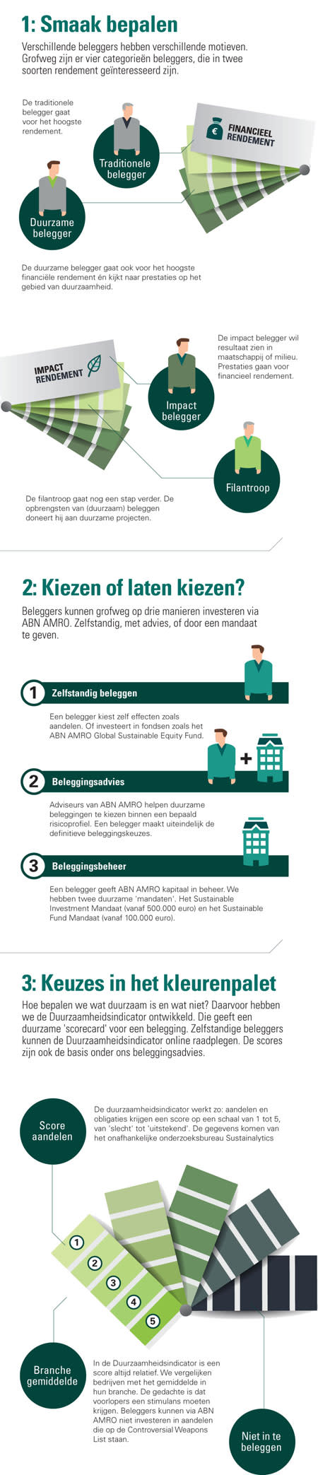 ‘Ruim vijf miljard euro is duurzaam belegd bij ABN AMRO. Een groot deel is ondergebracht in onze duurzame beleggingsmandaten. Bij zo’n mandaat vragen klanten ons om voor hen te beleggen. Deze duurzame mandaten groeien de laatste jaren enorm snel vergeleken met andere, traditionele vermogensbeheer mandaten. We zagen in 2014 een toename van 20 procent en in 2015 heeft deze trend doorgezet.’