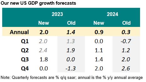Previously, we expected the economy to contract over Q4-Q1, with a significant rebound in activity in the second half of the year. We keep this profile broadly intact, but we have ‘softened the edges’ so to speak: the growth trough is now more shallow, but also the rebound is less pronounced. Net-net, this still means a significant upgrade to our annual average growth forecast for 2024, which goes to 0.9%, up 0.6pp from our most recent projection of 0.3%. Our forecast for 2023 also rises, to a large extent on the upward revision to Q1 - see table below: