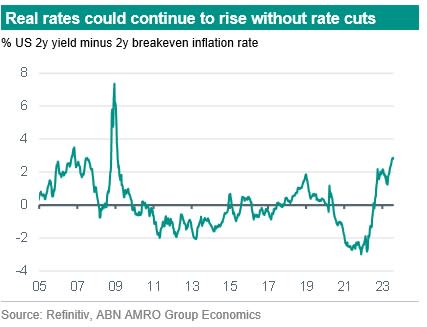 The change in our macro view has limited implications for monetary policy. We expect the Fed to keep rates on hold over the coming half year and to start a modest rate cutting cycle from March onwards. This is for three reasons. First, we continue to expect a significant slowdown to dampen wage growth and in turn inflationary pressure. Second, as mentioned previously, we have seen significant disinflationary progress in recent months, despite the resilience in the economy, and we expect that disinflation to continue assuming the economy does slow over the coming months. Third, Chair Powell and other influential FOMC members such as NY Fed president Williams have made clear that falling inflation by itself would justify rate cuts at some point next year – even without a recession. This is because with nominal rates on hold, real rates would continue to rise as inflation falls. To quote Williams, from an interview last week with the New York Times: "Assuming inflation continues to come down (…), if we don’t cut interest rates at some point next year then real interest rates will go up, and up, and up. And that won’t be consistent with our goals." (Bill Diviney)