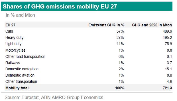 According to Eurostat, the mobility sector accounted for 21% of total EU emissions in 2020. Road transport is the biggest emitter in the mobility sector. It is responsible for around 95% of the total emissions of the mobility sector. The table below shows the greenhouse gas emissions of EU 27 in 2020 of the mobility sector in Megaton and as percentage of the total of mobility. Passenger cars account for 57% of emissions of the mobility sector. Commercial vehicles account for around 38% of the GHG emissions. This is the sum of emissions and percentages of heavy duty and light duty vehicles. In 2021 nearly 250 million cars were on the road in total. 29.5 million vans (up to 3.5 tonnes) were in circulation throughout the European Union and 6.4 million medium and heavy commercial vehicles and 714,000 buses.