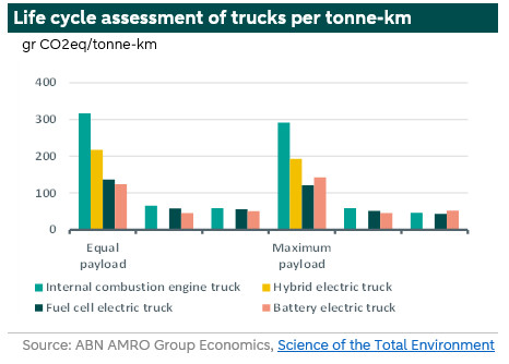 The graphs above are based on grams of emissions during the life-cycle per vehicle kilometre. This does not take into account the payload of the vehicles. For example, in the US, the trucks are larger so the life-cycle emissions per tonne-kilometre are lower than in the EU. The chart below shows the LCA for the US trucks taking into account the payload. According to data of the IEA, the total emissions of trucks per tonne-km for trucks world-wide in 2022 was 59, while for the Netherlands it was almost double of this mainly because of less tonnes per km transported.