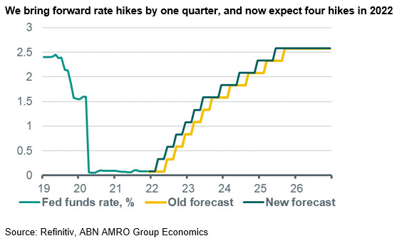 Following further unexpectedly strong labour market data last Friday, and a number of Fed speakers (Barkin and Bostic) since showing openness to a March interest rate rise, we have brought forward our expectation for the start of rate hikes from June previously. Following a 25bp hike in March, we continue to expect the Fed to hike at a quarterly pace until it reaches the pre-pandemic target range of 1.50-1.75%, but this is now expected to be reached one quarter sooner – in Q2 2023. As such, we now expect four hikes in 2022, up from three previously, while we continue to expect three hikes in 2023. From mid-2023, we expect the Fed to hike at a slower, semi-annual pace, while it seeks to gauge the impact of existing rate rises. We continue to expect the fed funds rate to peak at 2.5-2.75% in 2025, but there is naturally uncertainty surrounding a forecast this far out.