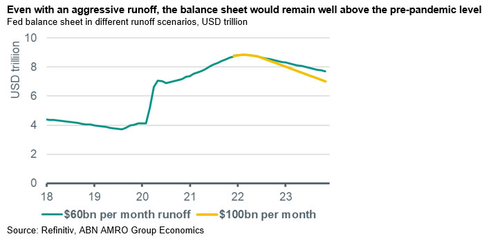 With the December FOMC minutes last week providing confirmation that the Fed is likely to take a more aggressive approach to winding down its balance sheet, we now expect this to begin soon after the March lift-off, perhaps as soon as May. According to the minutes, Committee members think the current environment of high inflation and a tight labour market, in combination with a significantly bigger balance sheet as a starting point, calls for a more rapid unwind of the balance sheet than during the 2017-18 ‘quantitative tightening’ (QT) episode. Last time, maturing Treasuries and MBS were allowed to roll-off the balance sheet, i.e. proceeds from redemptions were not reinvested, in amounts up to $50bn per month at the peak. Initially, we expect this new round of QT to start at a slow pace of $15bn per month, with the pace doubling each month until it reaches a $60bn per month pace (this amount includes both Treasuries and MBS; the Treasury portion being c.$40bn). However, our analysis of the Fed’s holdings – which are more skewed to the short-end of the yield curve this time around – suggest a theoretical maximum pace of around $100bn per month, and we do not rule out the Fed allowing the balance sheet to unwind at this pace. Even allowing the balance sheet to wind down at $100bn per month, at end 2023 the balance sheet would still be well over $2tn bigger than it was before the start of the pandemic.