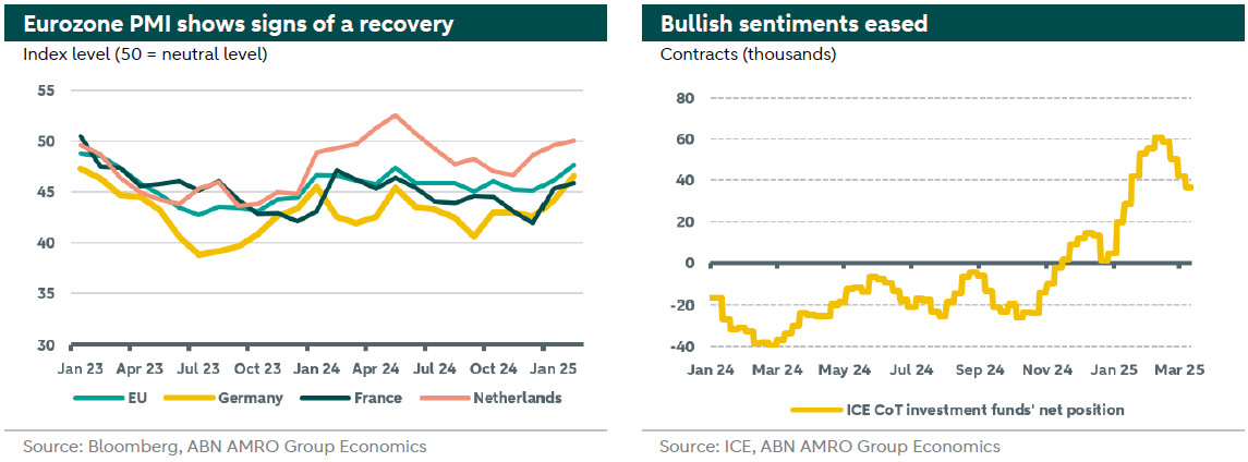 European industrial demand recovery continues. The Eurozone composite PMI for February remained constant, just above neutral in expansionary territory at 50.2. However, the eurozone economy witnessed an expanding manufacturing activity and a shrinking in the services sector. Crucially for carbon prices, manufacturing started to ramp up to 47.6 (46.6 in January). The pace of manufacturing contraction eased in main economies, most notably, with a surprising performance, in the industrial heavyweight Germany 46.5 (44.1 in January), as can be seen in the chart below (left). Current output and new (export) orders contributed to this improvement in the manufacturing PMI. This could be attributed to front loading impacts of the expected US tariffs under the new US administration. At the same time, these tariffs are expected to have adverse impacts on trade flows and growth in the EU (see our global outlook for 2025 here). This is expected to slow down the recovery in industrial demand, starting from the second half of 2025.