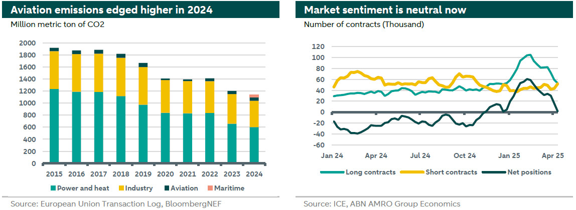 The tariffs on European exports are expected to adversely affect European growth over the coming months. However, the 90 days pause is expected to induce a front-loading positive effect on growth in the second quarter of 2025. Additionally, the impacts of the tariffs will be mitigated by the EU fiscal stimulus targeting infrastructure and defence spending. Though such impact will take time to come through but once it does it helps drive a recovery during the course of 2026. Accordingly, the recovery in industrial output and emissions could witness a slowdown in the second half of 2025 before picking up in 2026. Meanwhile, in 2026 the Border Carbon Adjustment Mechanism (CBAM) is expected to get into force. CBAM would, in theory, level the playing field between domestic and foreign producers in the EU market. The implementation of CBAM would also mean that many industrials will lose their free allowances which could decrease profitability and induce pressure on producers with relatively high emission profiles.