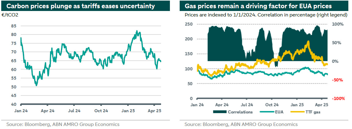 At their announced levels, the US tariffs have induced lower growth expectations for Asia, reducing the competition for LNG cargos coming to Europe and decreasing European gas prices. Carbon prices followed closely the developments in the gas market as the correlation between the two markets remains high, as illustrated in the chart above (right).