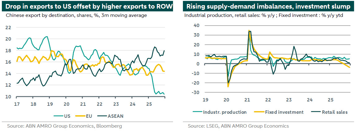 Last October’s agreement between Trump and Xi marked the continuation of a US-China truce, with tariffs cut and chokepoint restrictions (rare earths, semiconductors) postponed – also check our 2026 Outlook and podcast. Risks around this fragile equilibrium remain, with for instance Trump’s recent 25% tariff threat to countries trading with Iran. What is more, the recent US intervention in Venezuela, and US tensions with NATO partners around Greenland, may affect Beijing’s calculus regarding Taiwan, although we believe one-on-one comparisons between US/Venezuela (or Greenland) and China/Taiwan are flawed. In our base case, we still expect the US-China trade truce to remain broadly in place in 2026. As China’s export engine still functions, we stick to our view that we should not expect a support ‘bazooka’, but adherence to targeted stimulus – with the focus shifting a bit from consumption support to investment support (also see here). We also expect more piecemeal monetary easing in the form of mini policy rate and RRR cuts.