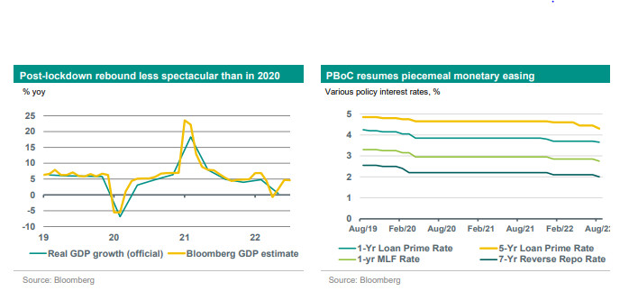 Our annual growth forecast for 2022 (3.7%) almost 2 %-points below Beijing's official growth target. Headwinds from Covid-19 policy, real estate and power shortages constrain post-lockdown rebound. Beijing resumes piecemeal monetary easing, steps up real estate and broader support as expected.