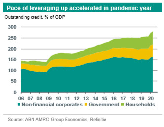 Support measures have resulted in a.o. an acceleration in infrastructure investment and a modest, and short-lived, acceleration in credit growth in the course of last year. Although the credit impulse was not at all comparable to the bazooka that was rolled out during the global financial crisis, it caused the pace of leveraging up to rise again (after some years or relative calm). Outstanding credit to the real economy broke a record high of 280% of GDP mid-2020, of which almost 60% is outstanding to the corporate sector (including SOEs). If interbank debt is taking into account as well, the overall leverage ratio has already passed 300% of GDP some years ago. All this raises the question to what extent the piling up of debt forms a risk to China’s macro outlook.