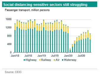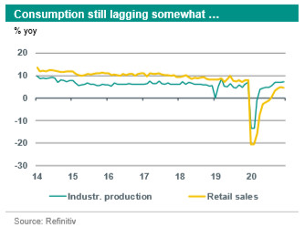 This outperformance mainly stems from the fact that China got control over the pandemic quickly, with ‘second waves’ of the virus so far being relatively contained, both in absolute and relative terms. China’s sharp recovery from the covid-19 collapse in Q1-20 is mainly driven by industry and exports, underpinned by supportive policies. Industrial activity and exports have profited from supply-side oriented policies that have helped firms getting back to business quicker than their foreign competitors, and from pandemic-specific demand for medical supplies and computer products (sectors for which China has a competitive edge). Meanwhile, private consumption is lagging, indicating that China’s aim to raise consumption’s share in GDP – a goal that was reconfirmed last year in the adoption of the dual circulation strategy (see below) – has clearly not taken off in the pandemic year of 2020. Particularly social distancing sensitive sectors such as passenger transport and the hospitality sector are still underperforming.