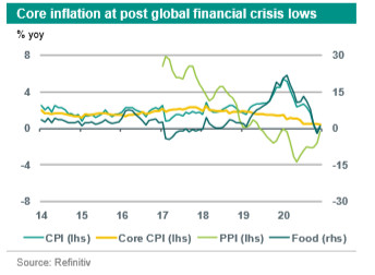 Headline inflation has fallen sharply in the course of 2020 year, despite the remarkable recovery from the covid-19 shock. CPI peaked at 5.4% yoy in January 2020, but has come down sharply since and even fell into negative territory in November 2020 (-0.5% yoy), before returning to positive numbers in December (+0.2%). These inflation dynamics are to a large extent driven by the food price cycle, particularly pork prices. Due to the impact of an earlier largescale swine flu outbreak on China’s hog population and production, pork price inflation has risen sharply reaching a peak of 135% yoy in February 2020. Since then, partly due to a turnaround in production and imports, pork price inflation has come down rapidly again, falling into negative territory since October 2020. Due to these large swings, pork prices have had a significant effect on the overall food price index and on China’s CPI. Core inflation (excluding volatile components such as food) had already fallen sharply in the course of last year, reaching a post global financial crisis low of 0.4% yoy in December. Going forward, we expect CPI inflation to pick-up again in the course of this year, although we have cut our annual CPI forecast for 2021 further down, to 1.5%. Meanwhile, producer price inflation is still in negative territory even despite China’s recovery. This to a large extent reflects past corrections in energy prices. That said, producer price deflation is rapidly fading out and we expect a return to positive territory soon.