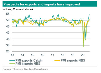 What also contributes to China’s recovery is the effective, targeted engineering of government support. Whereas in most developed economies support has been targeting the demand side, in China the focus has been on the supply side. That has facilitated Chinese factories in restarting production for the global market earlier than its competitors. In addition, China’s exports have in a way profited from the pandemic, as exports of medical supplies outperformed and so did exports of computers/tech products (reflecting the global shift to working from home). China is relatively strong in many of these industries. All this was visible in solid Chinese exports, even though global growth and trade underwent a lockdown-related collapse in Q2. The improved prospects for exports as well as imports are also visible in a clear improvement of the related PMI subindices, which are now back above the neutral 50 mark.