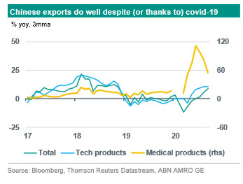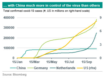 All in all, China is still on track to be the only key economy for which we expect positive annual growth this year (1.8%). That contrasts sharply with the annual contractions of almost 5% and 7.5%, respectively, that we expect for the US and the eurozone this year. In our view, the key factor explaining China’s outperformance stems from the fact that the country has been successful in getting the pandemic under control relatively quickly, even though it was the origin of covid-19 in late 2019. That success is a function of effective policy (lockdowns and other security measures, track and trace and extensive testing) and a different governance model with for instance softer privacy laws enabling the use of advanced IT-infrastructure.