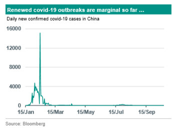 Experience with past epidemics also plays a role, as the authorities were better prepared in terms of stockpiles of medical supplies and action plans. Community discipline (self-quarantining, wearing face masks and general adherence to social distancing) is also a crucial factor. China has also experienced second waves, but so far these have been quite small relative to the size of the population (but also in absolute terms) as the authorities have generally reacted swiftly and decisively to keep contagion in check. Although second waves have had some effects on the local level, they have therefore so far hardly hampered the overall macro-economic recovery from the initial covid-19 shock.