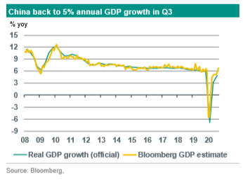 Economic growth back to 5% yoy in Q3. September macro data show momentum remains strong as we head into Q4. Containment of covid-19 is key factor to China’s growth outperformance. Exports profit from supply side policies and pandemic related demand. 14th Five-Year Plan covering 2021-25 will be in focus next week. Revising our end-2020 USD-CNY forecast.